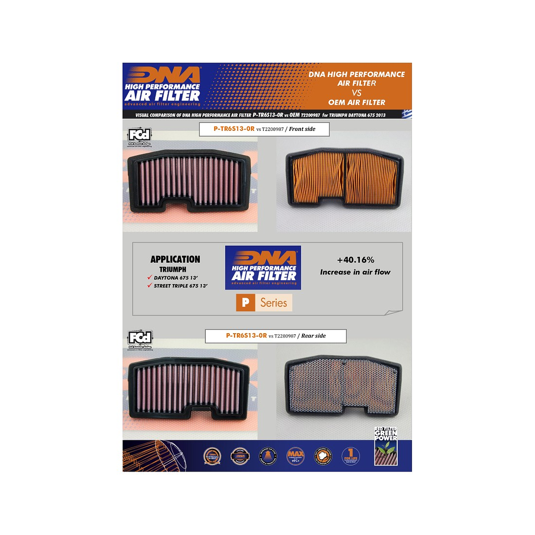 - El flujo de este filtro DNA Fcd es un 40,16% más que el filtro de papel original de Triumph.